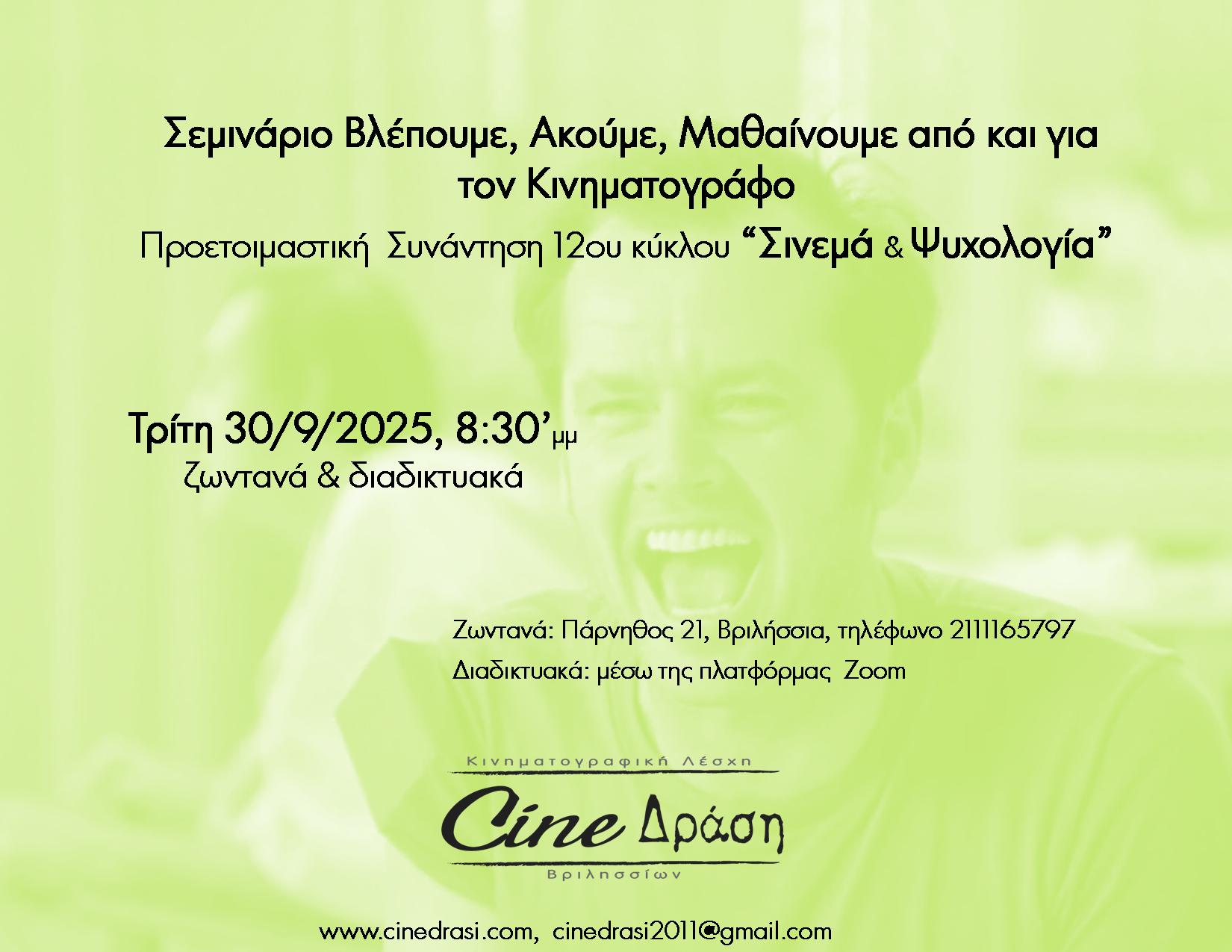 Η Κινηματογραφική Λέσχη Βριλησσίων Cine Δράση συνεχίζει για 11η χρονιά το Σεμινάριο Ιστορίας του Κινηματογράφου με γενικό τίτλο «Βλέπουμε, Ακούμε, Μαθαίνουμε από και για τον Κινηματογράφο». Ο 12ος κύκλος που ξεκινάει τον Οκτώβριο και θα διαρκέσει μέχρι τον Ιούνιο του 2026 έχει ως θέμα: «Σινεμά και Ψυχολογία». Εισηγητής ο Παναγιώτης Δενδραμής. Το σεμινάριο πραγματοποιείται ζωντανά και διαδικτυακά μέσω της πλατφόρμας zoom.